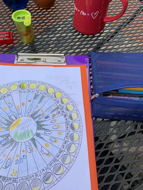 After doing some research, I decided I wanted to create a wheel of my own. I wanted to do a monthly wheel to record the weather and moon cycle. I was able to find a blank template to help me get started. I made my observations each morning. The center of the wheel is a focus point of your nature study. I used it to document a significant event spent in the natural world during the month of August. This is an incredibly grounding practice. It is a wonderful way to spend time being still, quiet, and to connect with the Earth.